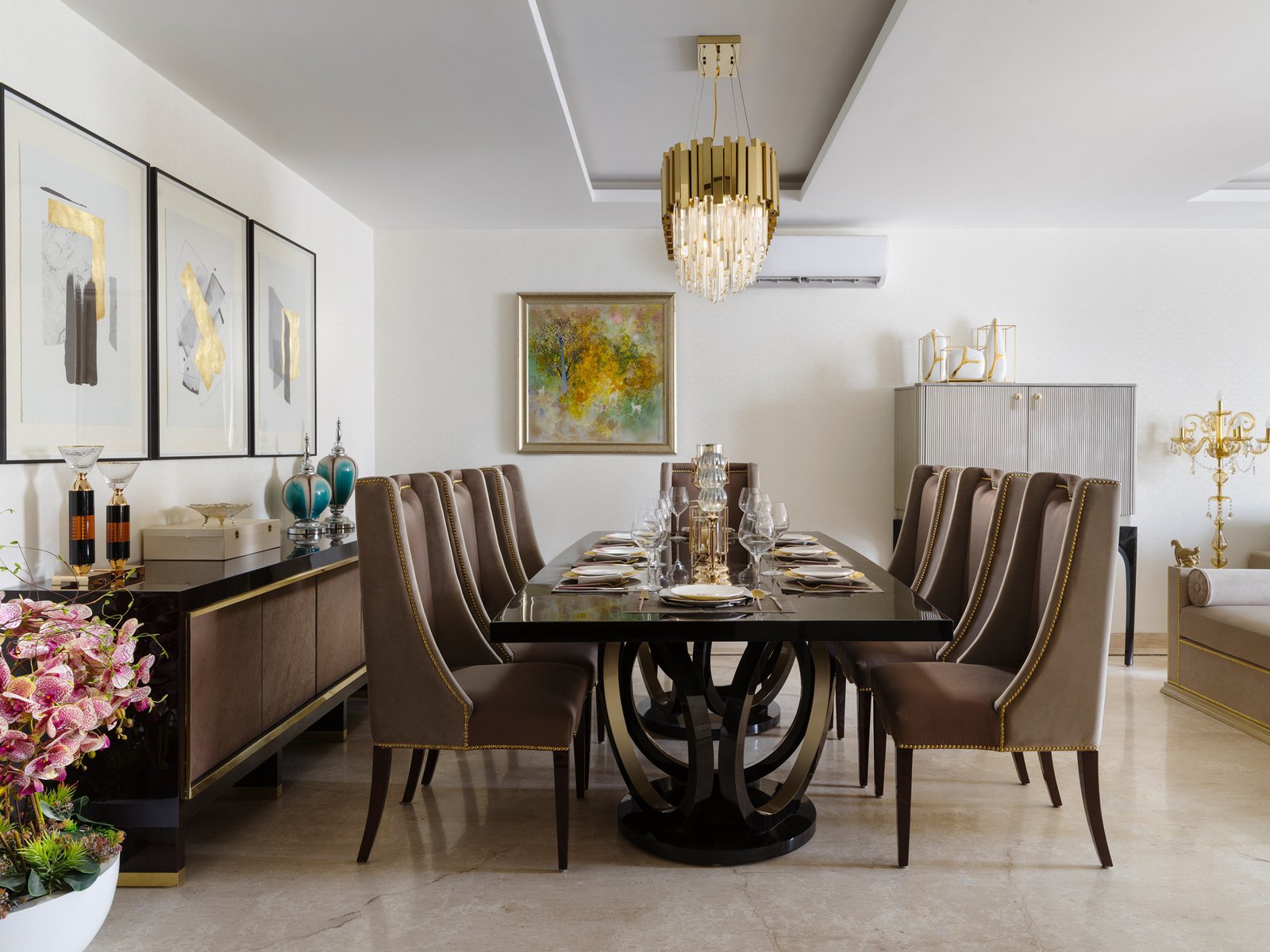 The dining room layout involves determining the placement of furniture and other elements within the space. It's important to consider factors like traffic flow, accessibility, and the available square footage. The arrangement should allow for easy movement around the table and accommodate the number of people you intend to seat. The design of a dining room takes into consideration various elements to create a functional, comfortable, and aesthetically pleasing environment for dining and entertaining. Here's an explanation of some key aspects of dining room interior design.
